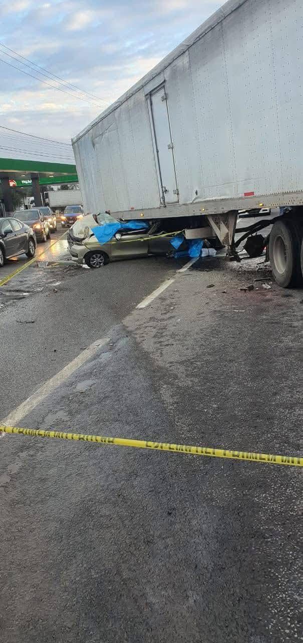 Según los primeros reportes, un tractocamión color rojo impactó de frente contra un vehículo Toyota Avanza gris, con placas del estado de Hidalgo, que quedó completamente destruido. En su interior viajaban las tres víctimas fatales, que murieron en el lugar del accidente.