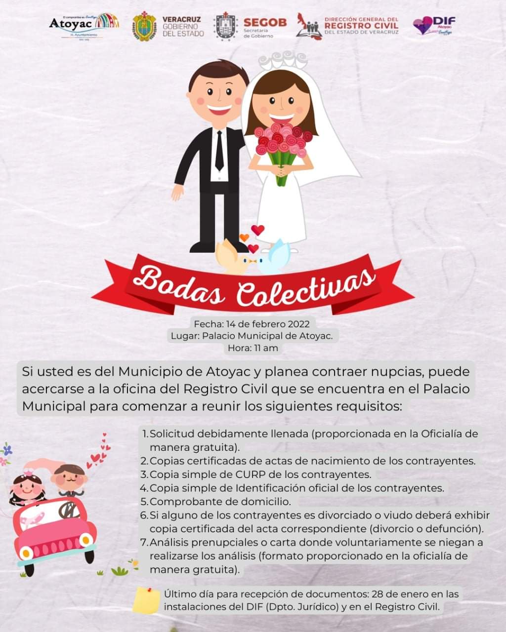 Atoyac, Ver.- En colaboración con el Gobierno del Estado, el Ayuntamiento de Atoyac que preside el alcalde Carlos Alberto Ventura de la Paz, anunció la realización de la campaña de “Bodas Colectivas 2022”, que se llevará a cabo el lunes 14 de febrero en el Palacio municipal a las 11 de la mañana.