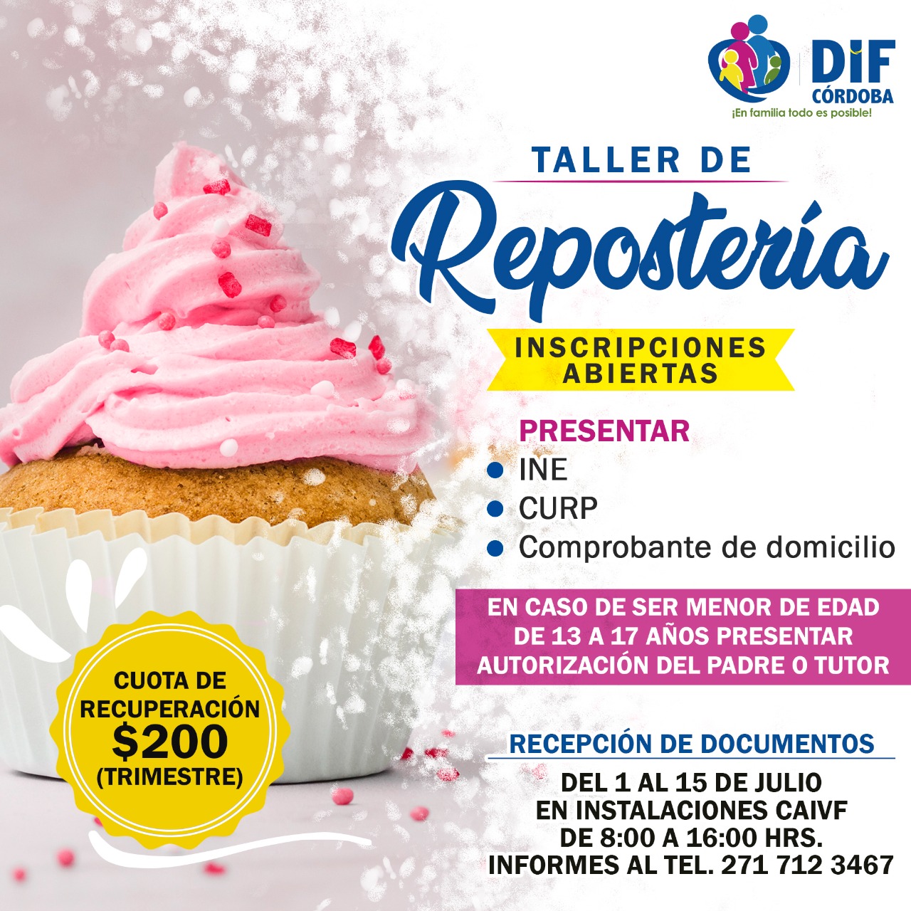 Las inscripciones serán a partir de este viernes 02 de julio y hasta el 15 de julio en las instalaciones del CAIVF de lunes a viernes en un horario de 8:00 de la mañana a 4:00 de la tarde, para mayores informes al 271 712 34 67.