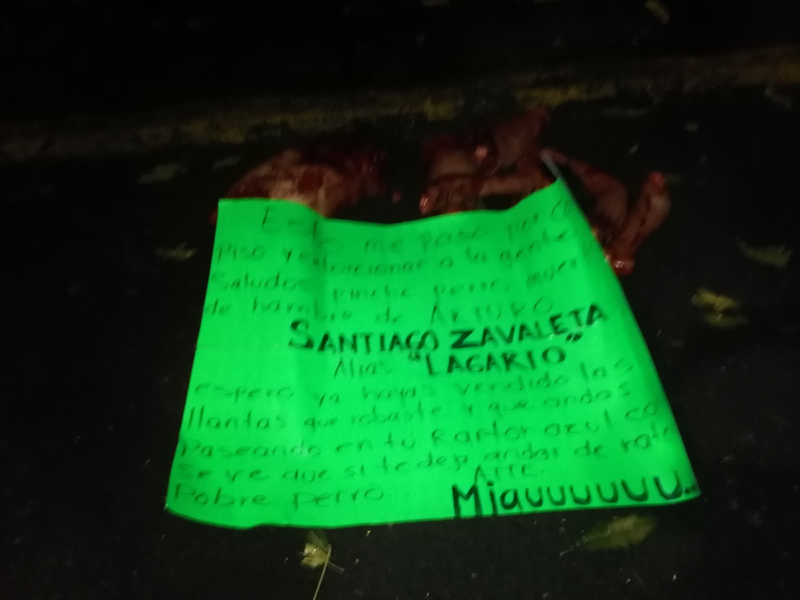 ‘Esto me pasó por cobrar piso y extorsionar a la gente, saludos pinche perro muerto de hambre de Arturo Santiago Zavaleta alias El Lagarto, espero ya hayas vendido las llantas que robaste y que andas paseando en tu Raptor azul, se ve que si te deja andar de rata, pobre perro. Atte. Miauuuuu’, decía la cartulina.