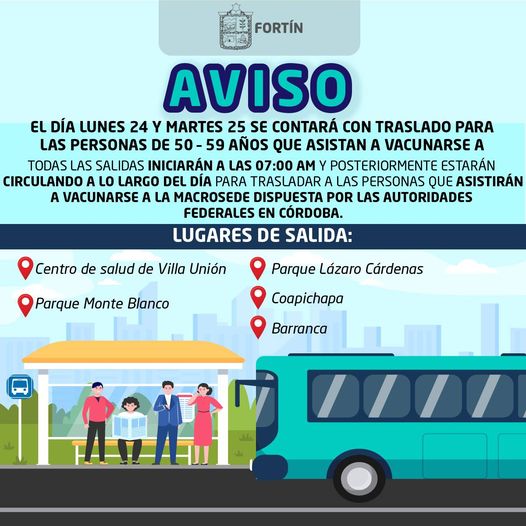 Fortín, Ver. – Derivado de la disposición oficial por parte de la Secretaría del Bienestar y el Gobierno del Estado de Veracruz para el cambio de esquema de vacunación en todo la entidad, la sede de vacunación para adultos fortinenses de 50 a 59 años se realizará en la ciudad de Córdoba este lunes y martes.
