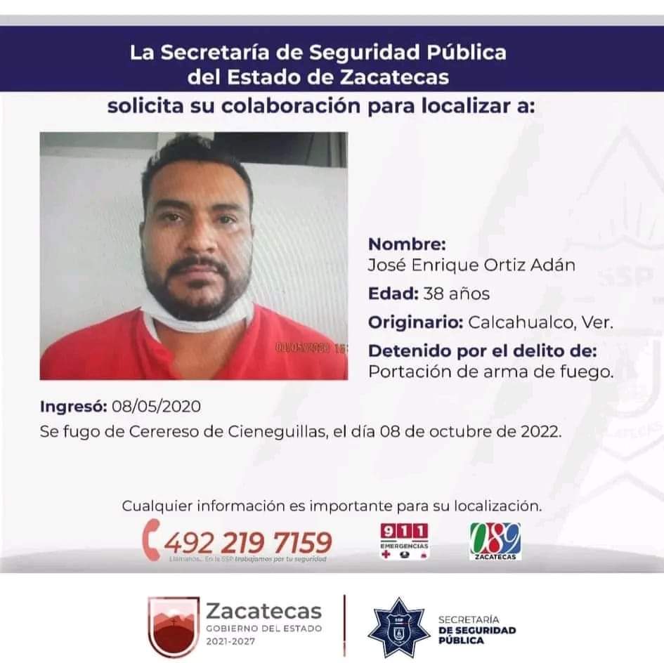 De acuerdo a la información de las autoridades de aquel estado, el fugitivo responde al nombre de José Enrique Ortiz Adán, de 38 años de edad, el cual fue detenido por portación de arma de fuego.