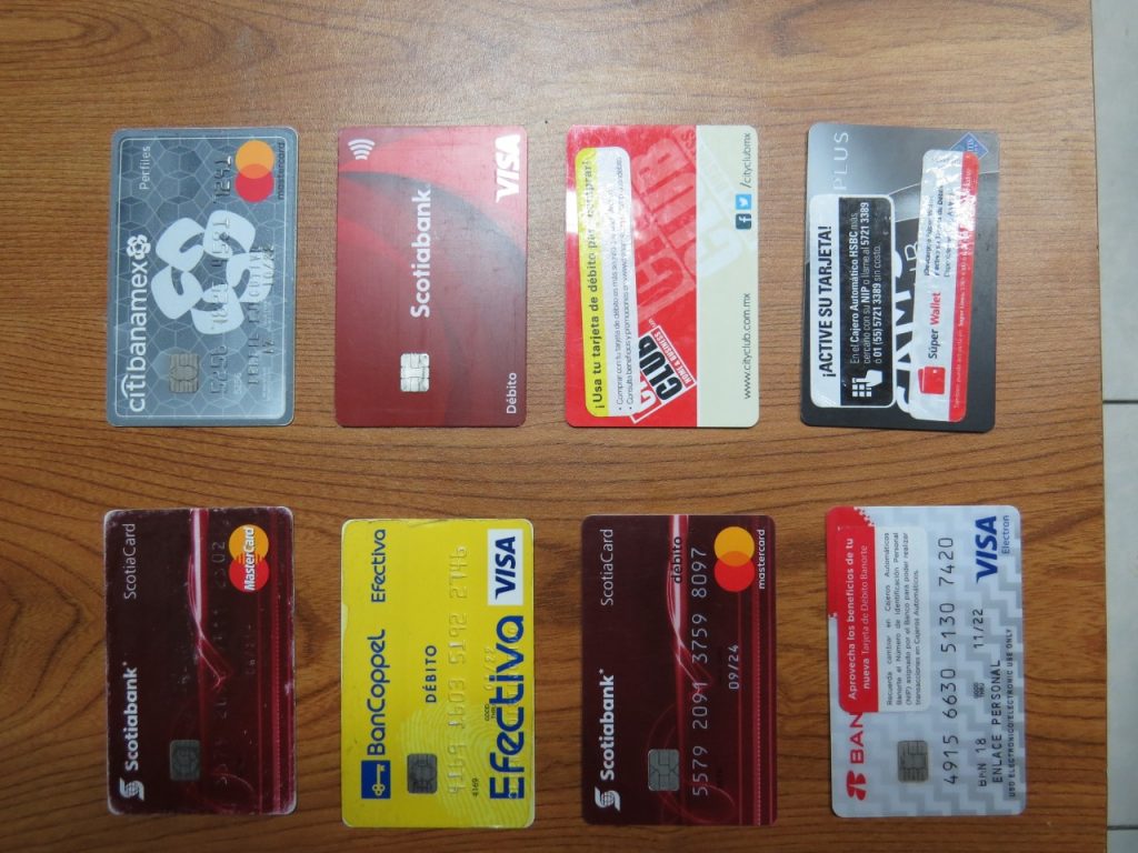 Finalmente, en la revisión, le hallaron tarjetas de Banamex, Scotiabank, BanCoppel, Banorte, City Club y Sams Club, pertenecientes a diferentes personas.