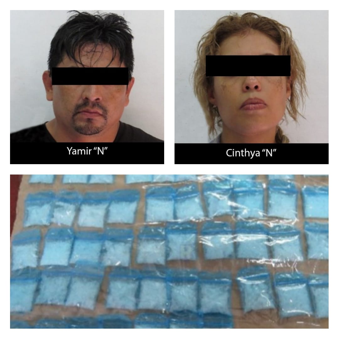 Tras ser inspeccionados, les fue asegurada una bolsa negra tipo monedero con una gramera color gris y 47 bolsitas con droga cristal.