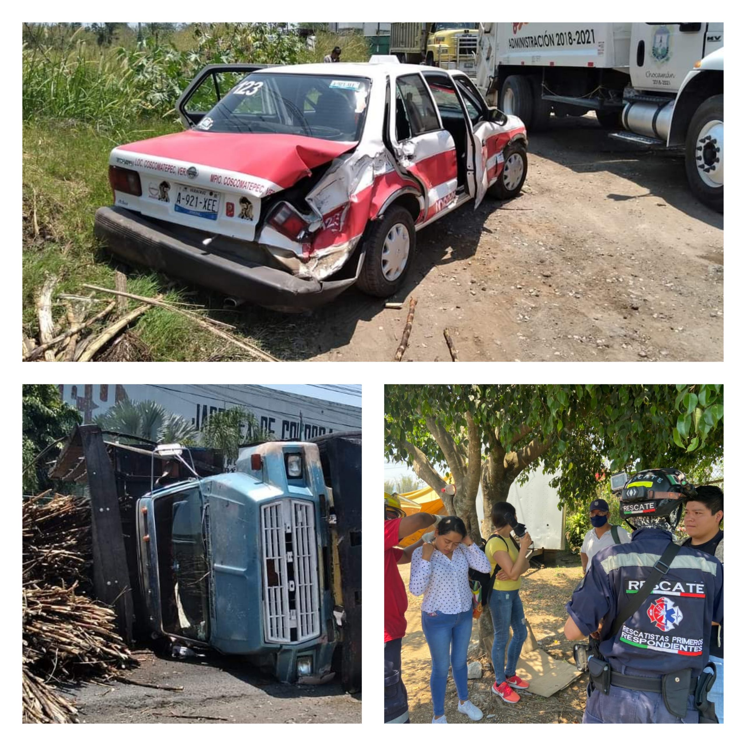 Fortín, Ver. – Un camión cargado de caña volcó y ‘aplastó’ a un taxi en el cual viajaba seis personas.