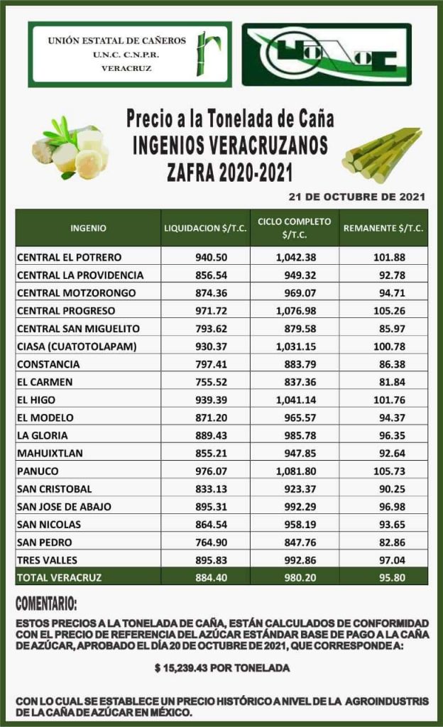 El dirigente estatal de la Confederación Nacional de Propietarios Rurales (CNPR), Ángel Gómez Tapia, subrayó que el precio de referencia para la zafra 2021-2022 quedará en 15 mil 239. 43 pesos, el que debe ser publicado en el Diario oficial de la Federación.