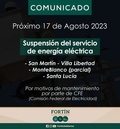 Fortín, Ver. – La Comisión Federal de Electricidad (CFE) informó a los habitantes de las congregaciones del municipio de Fortín sobre una suspensión temporal del servicio de energía eléctrica.
