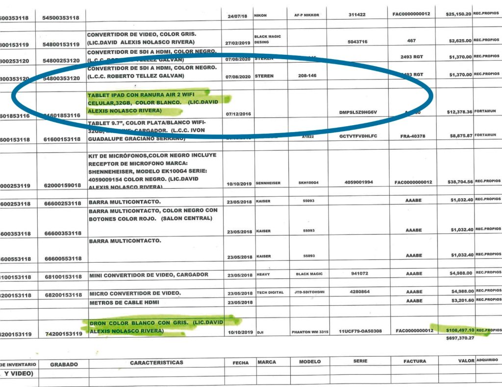 David Alexis Nolasco Rivera, ex Jefe de Medios, también causó un grave daño al erario público municipal, entregó inservible un Dron DJ Phantom 4 Pro-Plus, pagado en 108 mil 497 pesos y también entregó dañadas 4 cámaras Nikon y sus lentes, así como 2 cámaras de videos.