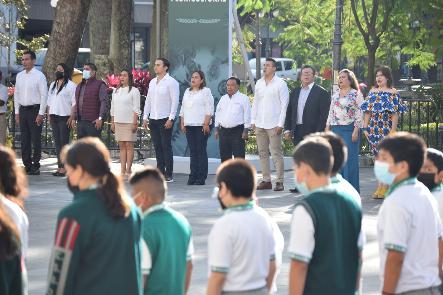 Posteriormente, la alumna Vania Ximena Medina Hernández, se encargó del juramento a la Bandera, para dar paso a entonar el Himno Nacional y el de Veracruz, acompañados por la Banda de Música Municipal.