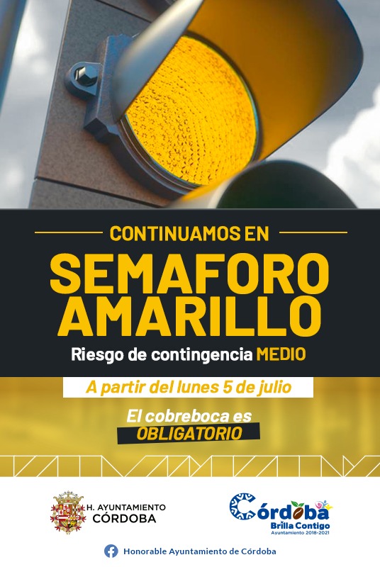 Alertó que lunes 5 al martes 18 de julio, el municipio de Córdoba se mantendrá en color amarillo del semáforo epidemiológico, lo que representa que el riesgo de contagio por SARS-CoV-2, es alto.