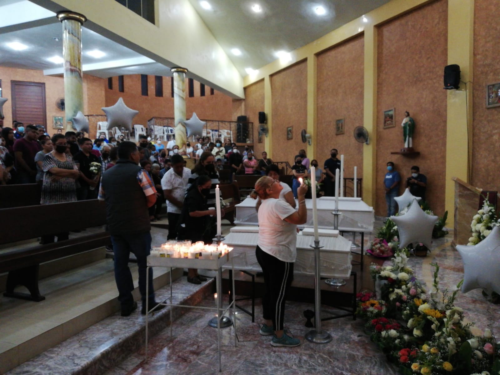 Los féretros blancos llegaron cerca de las 20:00 horas hasta la iglesia corpus Christhi, donde serán velados.