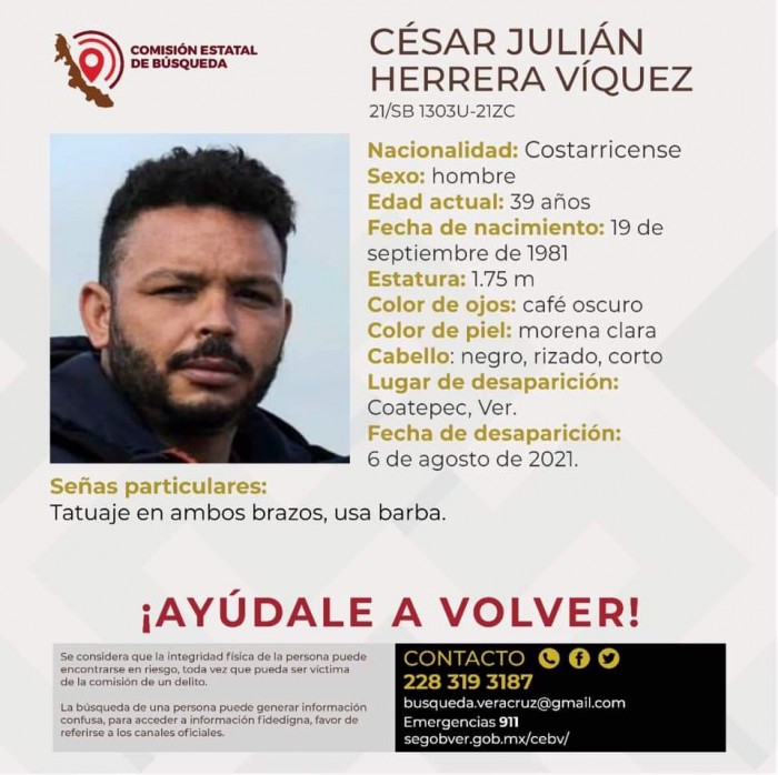 Cabe destacar que la Comisión Estatal de Búsqueda emitió la ficha de búsqueda en la que señala que César Julián tiene como señas particulares tatuaje en ambos brazos y usa barba