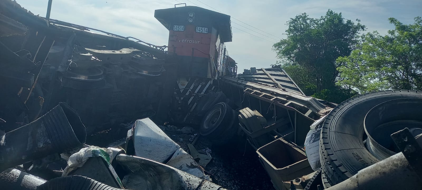 El tráiler intentó ganarle el paso al ferrocarril de carga, lo que provocó que la locomotora arrastrara la pesada unidad varios metros, hasta quedar completamente destrozada.
