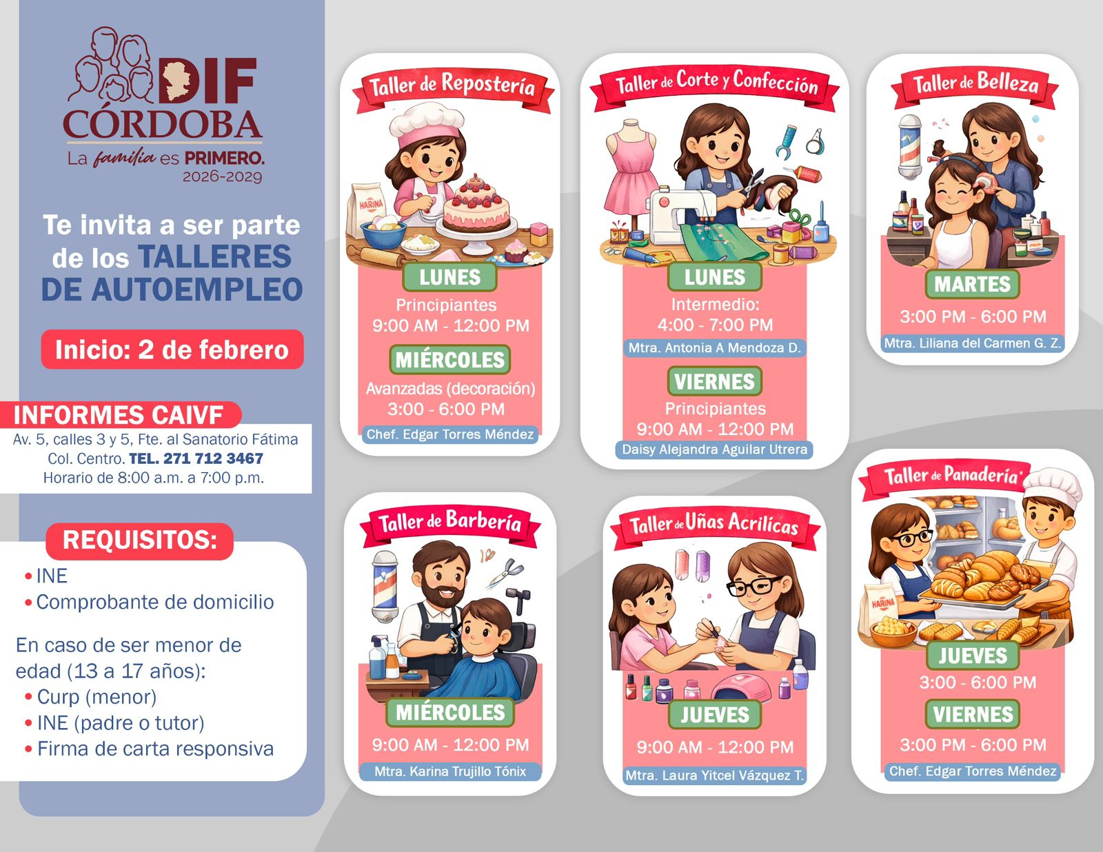 Estas acciones forman parte del impulso del autoempleo, la inclusión productiva y el fortalecimiento de las familias. Los talleres de repostería, corte y confección, belleza, panadería y aplicación de uñas acrílicas se impartirán a partir del 2 de febrero en las instalaciones del Centro de Atención Integral a Víctimas de Violencia Familiar (CAIVF).