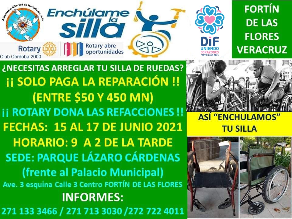 Fortín Ver.- Ocupados de las necesidades de grupos vulnerables Fortinenses, el Sistema Municipal para el Desarrollo Integral de la Familia (DIF Fortín) en coordinación con el Club Rotario “Córdoba 2000” y la asociación Autonomía Libertad en Movimiento AC (ALEM), realizarán la campaña “Enchúlame la Silla”.