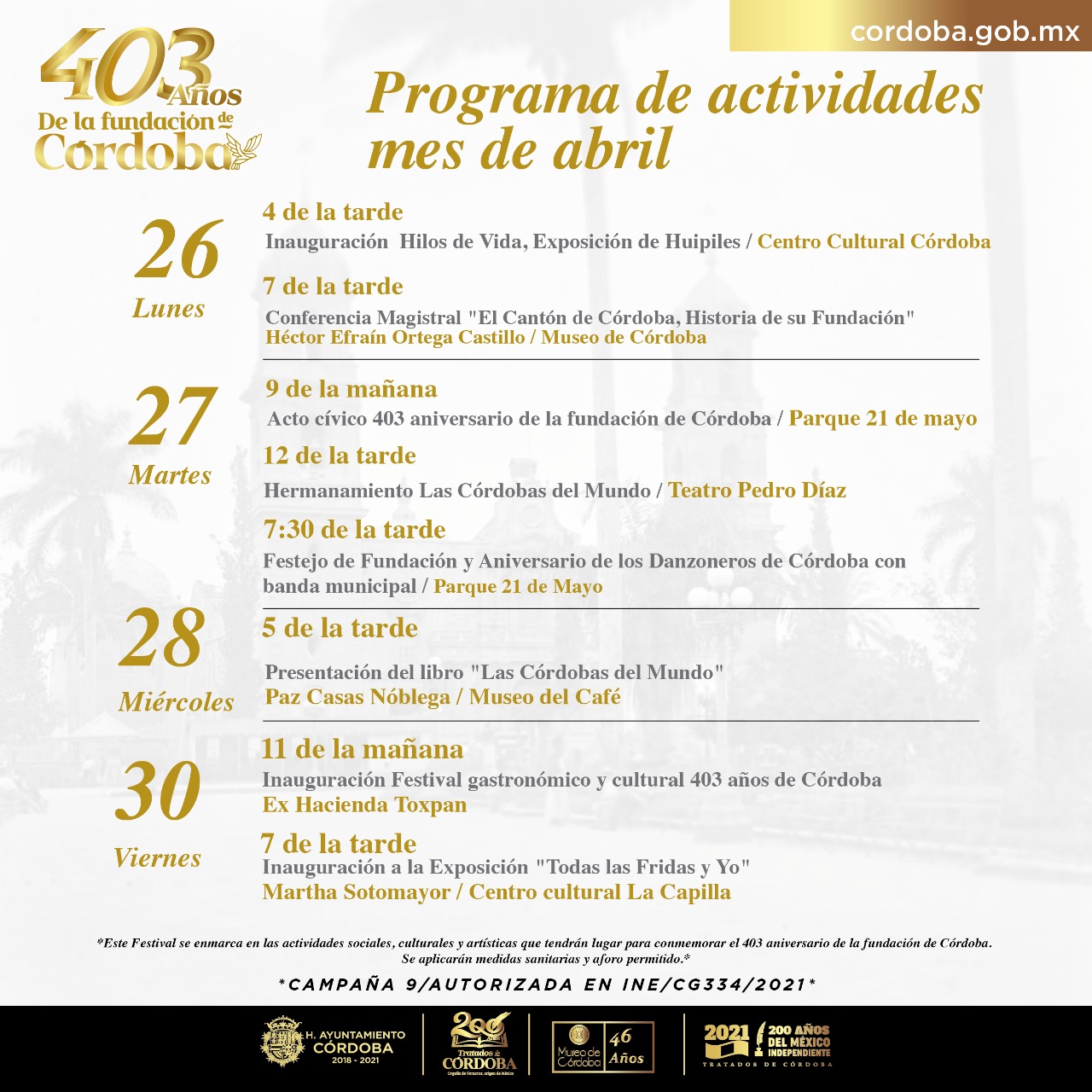 El 27 de abril a las 9 horas se realizará el acto cívico conmemorativo del 403 aniversario de la Fundación de Córdoba en el parque 21 de mayo. A las 12 horas, del mismo día, se llevará a cabo el evento, Intercambio Cultural de las Córdobas del Mundo, en el teatro Pedro Díaz, y a las 19:30 horas se presentará la Banda Municipal junto a los danzoneros de Córdoba en el parque 21 de mayo.