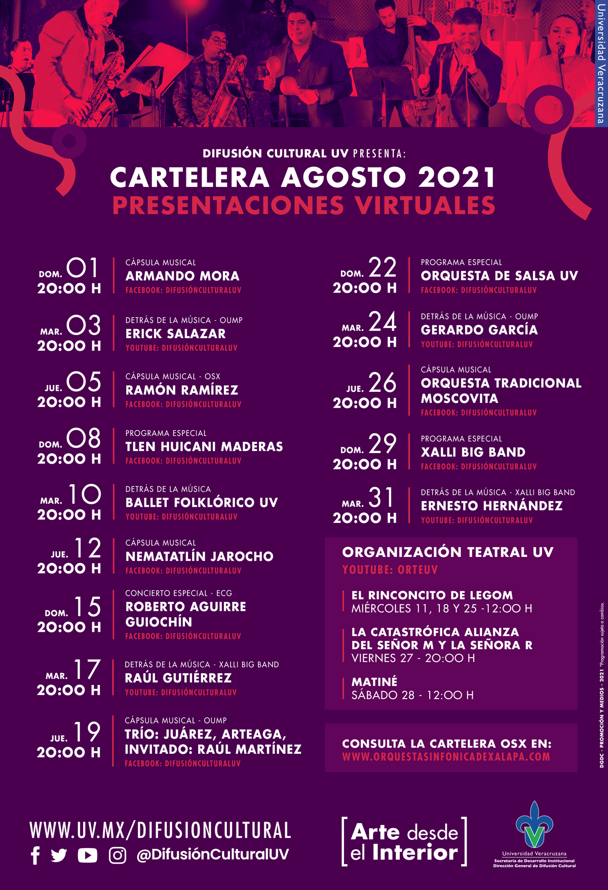 Región. – En este mes de agosto, la Dirección General de Difusión Cultural de la Universidad Veracruzana comparte para todo el público su nueva cartelera de presentaciones virtuales, para disfrutar de todo el Talento UV con el que cuenta nuestra Máxima Casa de Estudios.