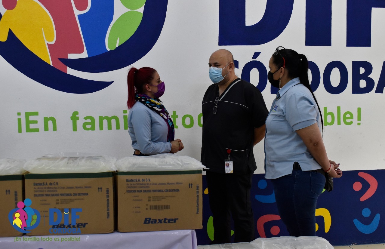 Monserrat Cuenca Villegas, directora del DIF de Córdoba, hizo esta entrega de más de 30 cajas de la marca Baxter al director del hospital, Miguel Ángel Cruz Mendoza para ayudar a todos esos pacientes que acuden a la unidad de diálisis en busca de este servicio.