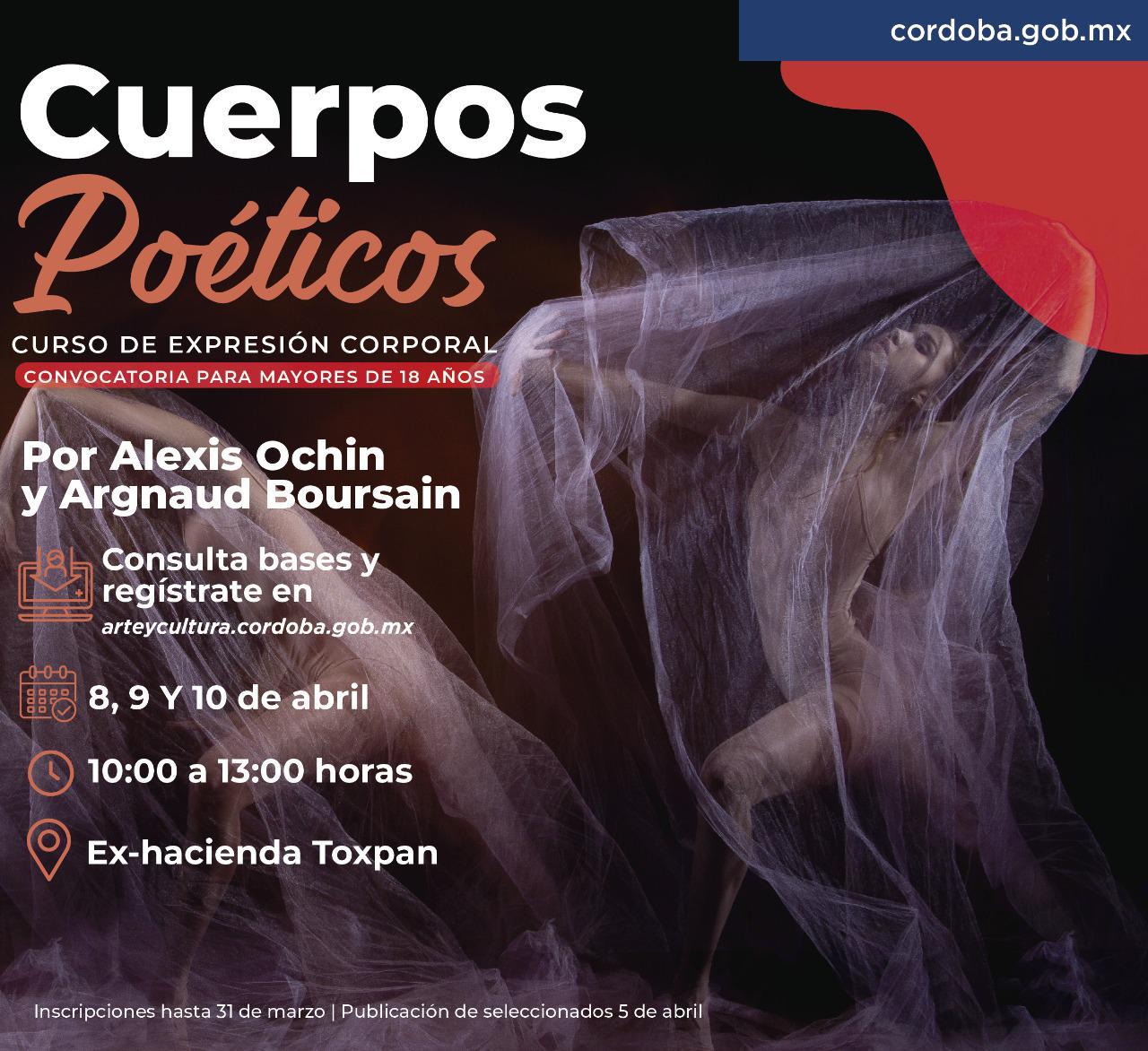 El Ayuntamiento de Córdoba, a través de la Dirección de Educación, Cultura y Deporte, informó que Cuerpo Poético tendrá lugar del ocho al diez abril, en horario de 10 a 13 horas, en las instalaciones de la exhacienda San Francisco Toxpan.