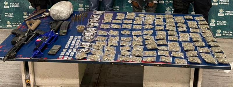 Dentro del decomiso efectuado se encuentran: cuatro armas de fuego, cargadores, cartuchos, dosis de marihuana y de cristal, una báscula gramera y un vehículo Volkswagen.