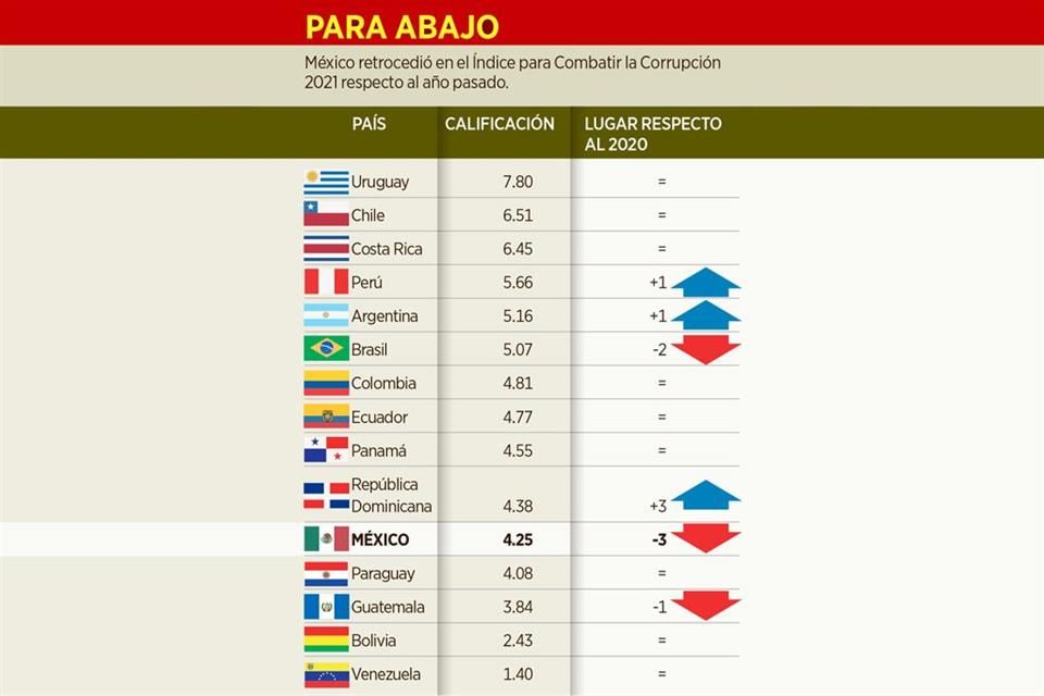 Ciudad de México. – México descendió tres lugares en el Índice de Capacidad para Combatir la Corrupción 2021, que realiza la organización internacional Americas Society/Council of the Americas y que mide la suficiencia de las naciones para prevenir, investigar y sancionar los actos de corrupción.