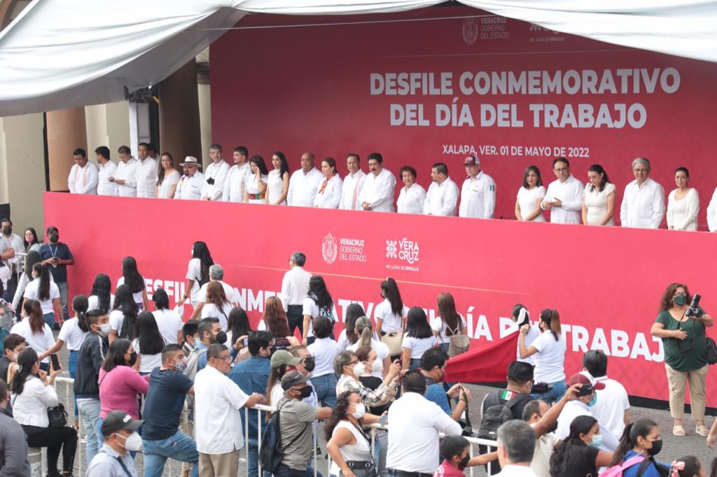Xalapa, Ver.- El gobernador Cuitláhuac García Jiménez encabezó este domingo el desfile que conmemora el 136 aniversario del Día Internacional del Trabajo, en el cual participaron 32 mil 410 empleadas y empleados que expresaron sus demandas laborales ante la autoridad.