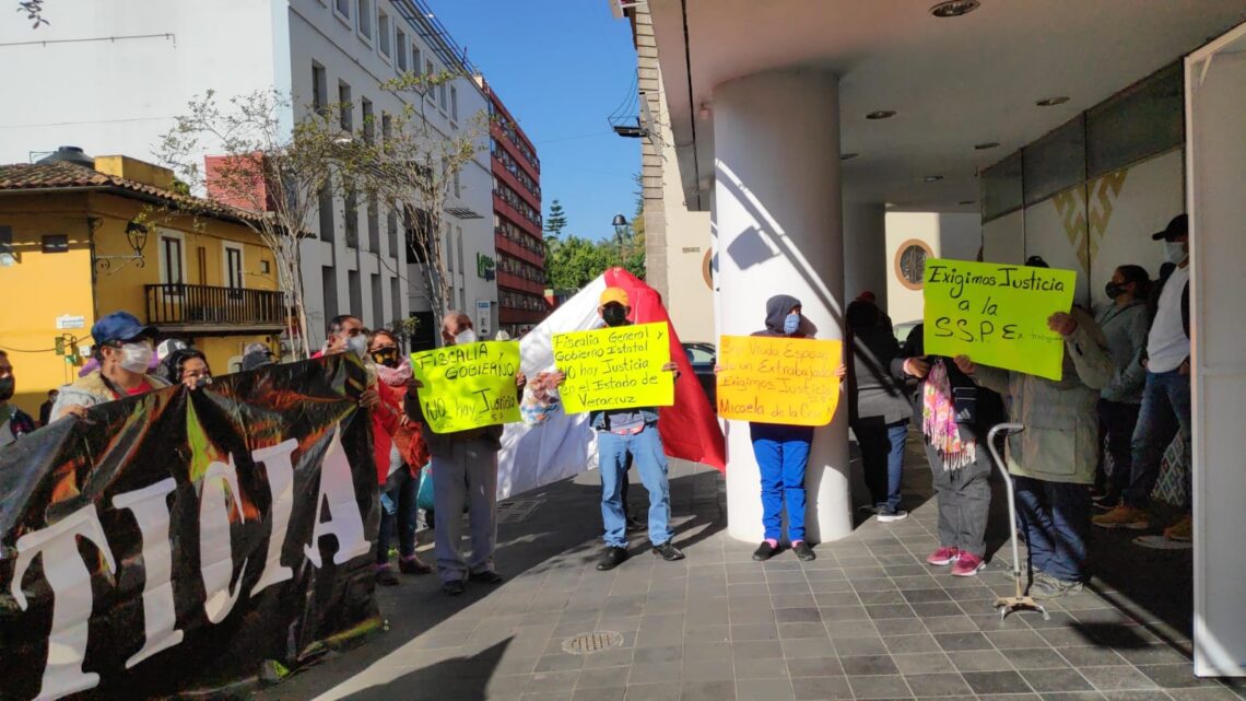 Los inconformes protestaron frente a Palacio de Gobierno y posteriormente en las oficinas centrales de la Secretaría de Seguridad Pública para exigir un adeudo desde el 2015 y castigo por la expedición de cheques.