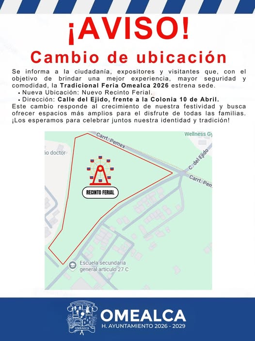 Omealca, Ver.– La Tradicional Feria Omealca 2026 tendrá una nueva sede, el Ayuntamiento confirmó el cambio de ubicación del evento, que ahora se realizará en el Nuevo Recinto Ferial, ubicado en la calle del Ejido, frente a la colonia 10 de Abril.