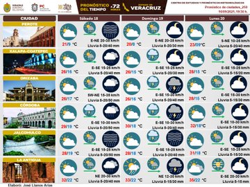 Para el sábado se esperan lluvias de 5 a 20 mm con más de 30 a 50 mm en cualquier punto del Estado y, de 50 a 70 mm en la cuenca del Papaloapan, en especial en la zona alta.