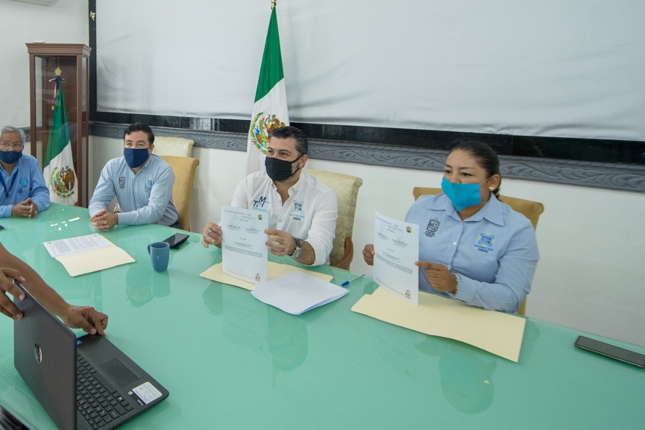 De esta forma el presidente municipal, el Lic. Antonio Mansur Oviedo en compañía de la Síndica Municipal, Rosa Ana Marañón Reyes; el Secretario Municipal, Nahum Gerardo Romero Muñoz; así como Jerónimo Quevedo García, Director de la Comisión de Agua y Saneamiento de Fortín (CASF) y Jesús Pineda Ramírez, Director de Obras Públicas y Desarrollo Urbano realizaron la firma de dicho convenio ante la secretaria y la subdirectora del INSUS.