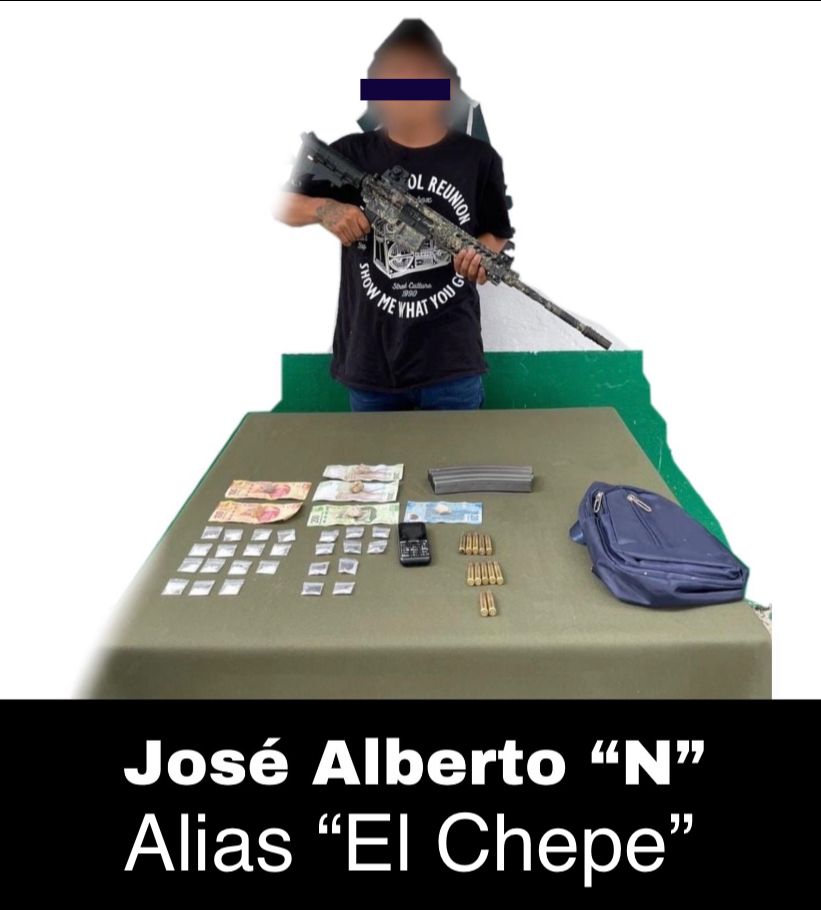 El detenido se identificó como José Alberto “N” alias “El Chepe” y le aseguraron un arma de fuego larga, con un cargador abastecido de cartuchos útiles y una mariconera que en su interior contenía 10 dosis de la droga conocida como cristal y