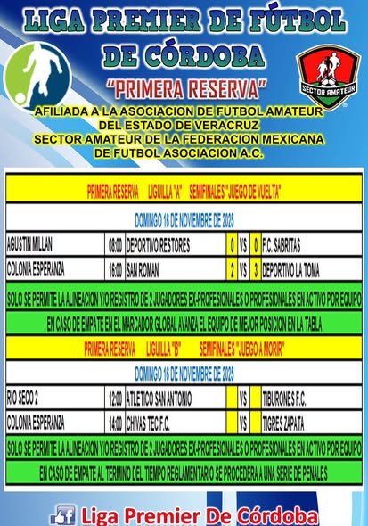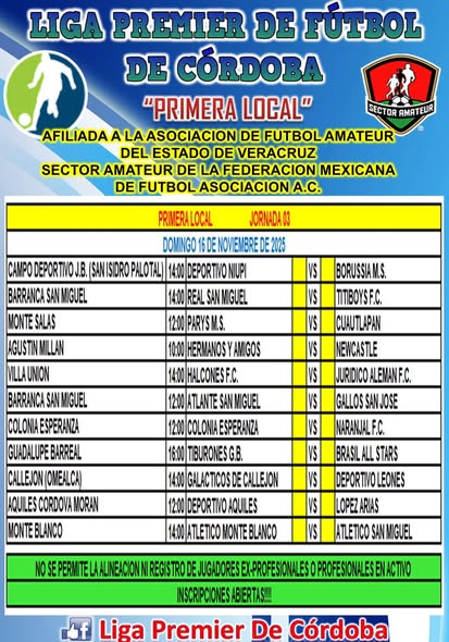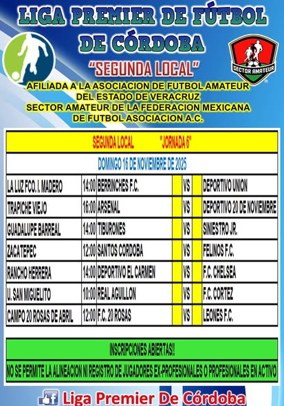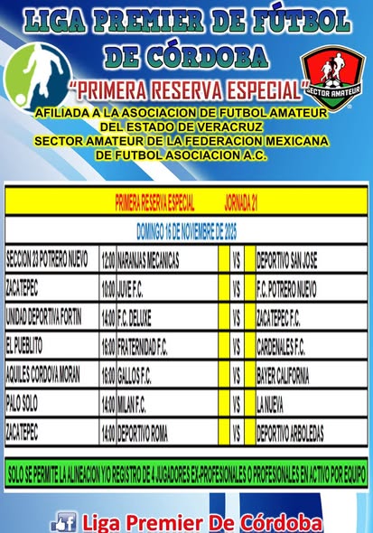 Córdoba, Ver.– La pasión por el fútbol amateur se vivirá con fuerza este domingo 16 de noviembre, cuando la Liga Premier de Fútbol de Córdoba dispute actividad en sus cuatro categorías: Primera Reserva Especial, Primera Local, Primera Reserva (Liguilla) y Segunda Local, con encuentros decisivos que prometen emociones en los distintos campos de la región.