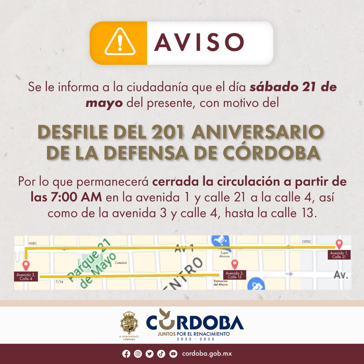 Córdoba, Ver. – Con motivo de las actividades cívicas y deportivas a desarrollarse este fin de semana, el Ayuntamiento de Córdoba informa a la ciudadanía sobre el cierre parcial en las principales vías del centro por el desfile del “201 Aniversario de la Defensa de Córdoba”, y el maratón Bicentenario a realizarse el domingo 22 de mayo.