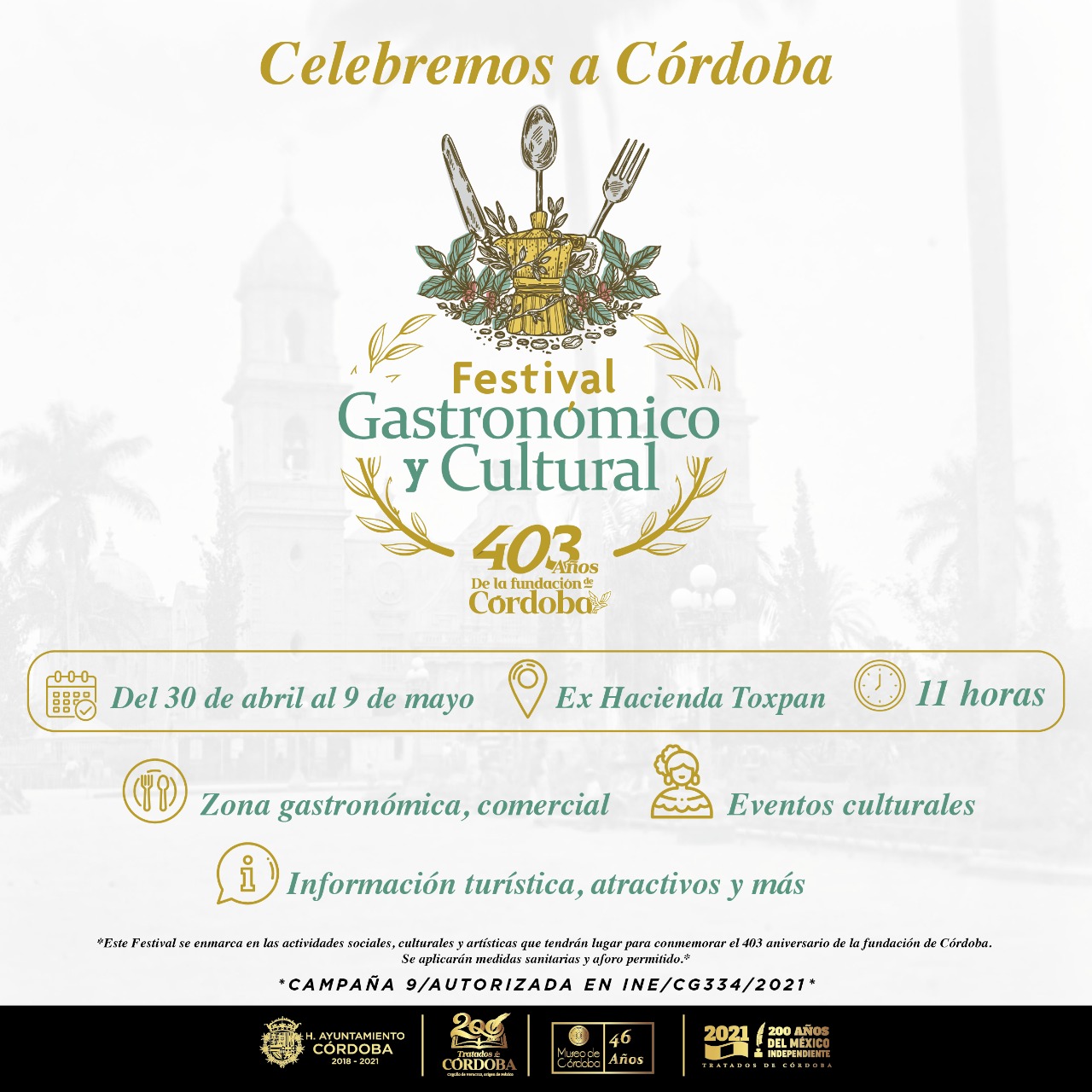 Córdoba, Ver. – Como parte de las actividades para conmemorar la fundación de Córdoba, se llevará a cabo el Festival Gastronómico-Cultural 403 años del viernes 30 de abril al domingo 9 de mayo, teniendo como sede la exhacienda San Francisco Toxpan.