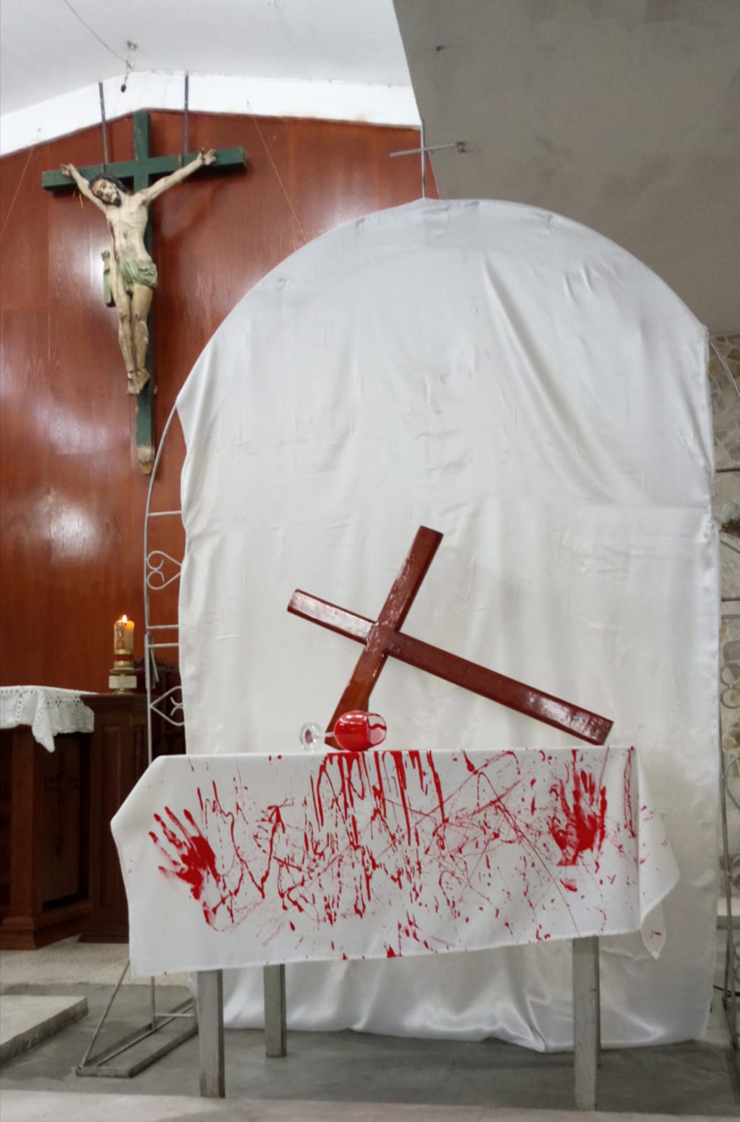Como signo de estos crímenes, se colocó a un lado del Altar una Cruz “caída”, una copa y la sangre derramada.