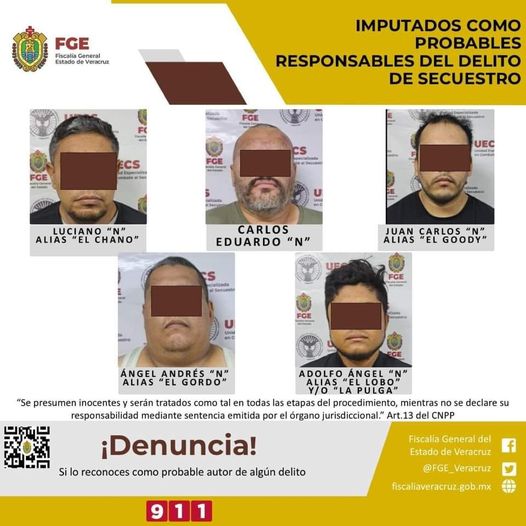 Tierra Blanca, Ver. – La Fiscalía General del Estado informa que, a través de la Unidad Especializada en Combate al Secuestro, realizó imputación en contra de Juan Carlos “N” alias “El Goody”, Luciano “N” alias “El Chano”, Adolfo Ángel “N” alias “El Lobo” y/o “La Pulga”, Ángel Andrés “N” alias “El Gordo” y Carlos Eduardo “N” como probables responsables del delito de secuestro en agravio de siete personas y una menor de edad, de origen Venezolano, Hondureño y Colombiano, así como de la víctima J.L.B.C.