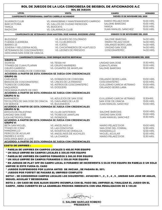 Para el sábado 15 de noviembre, el béisbol de experiencia entra en acción con el Campeonato de Veteranos Gran Masters “José Manuel Bozzier López”, que enfrentará a equipos tradicionales como Fuerza Guerrera, Club Amigos, Rijes de Colopapa y Veteranos de Coscomatepec.