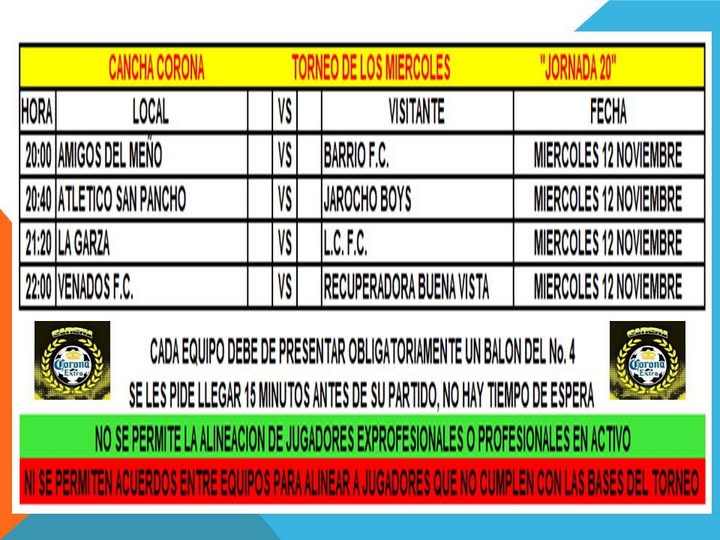 Córdoba, Ver.— Este miércoles 12 de noviembre se juega la Jornada 20 del tradicional Torneo de los Miércoles en la Cancha Corona, donde los equipos locales buscarán sumar puntos y mantener viva la pelea por los primeros lugares.