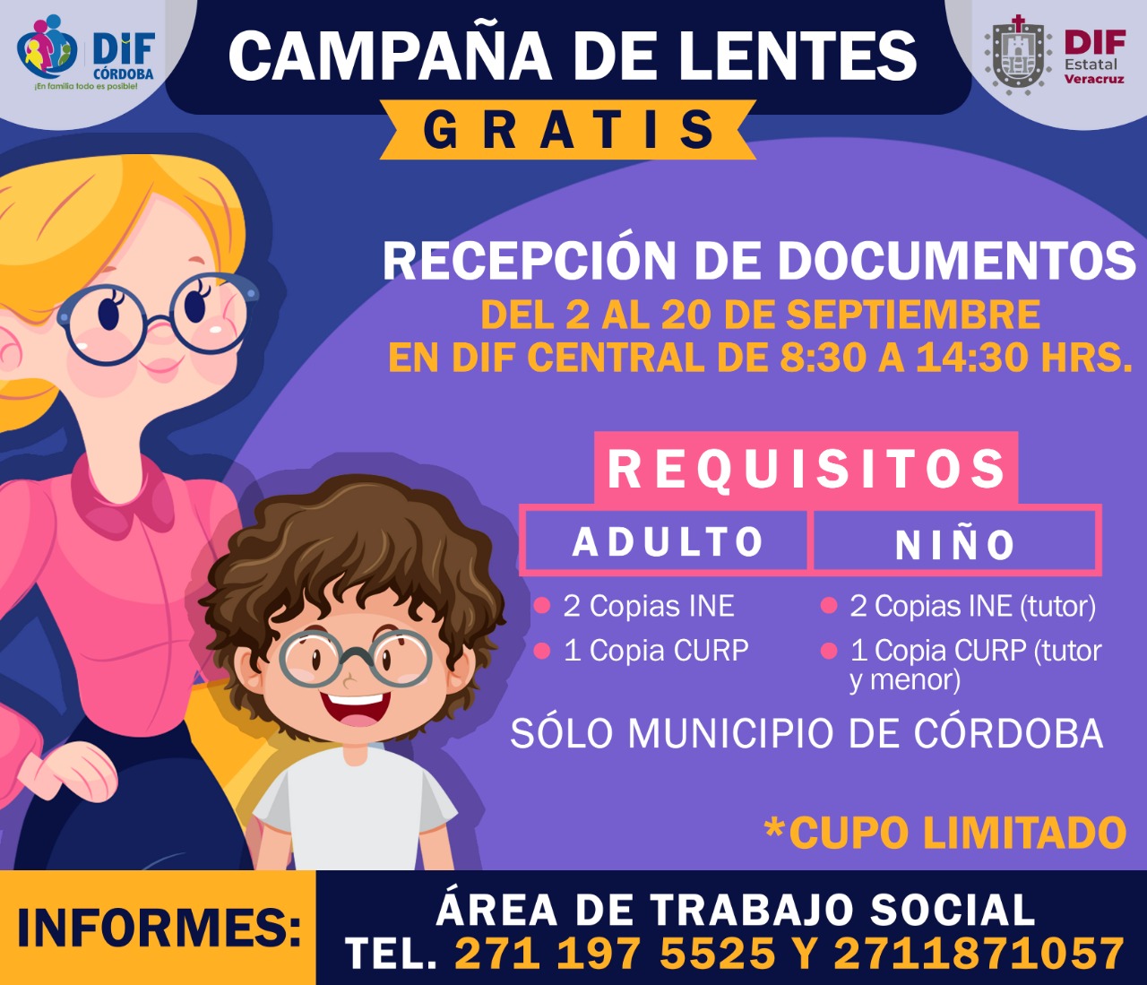 Córdoba, Ver.- El Sistema Municipal para el Desarrollo Integral de la Familia (SMDIF) en coordinación con el DIF Estatal, invitan a toda la población cordobesa que requiere de anteojos a participar en su “Campaña de Lentes Gratuita” que dará inicio con la recepción de documentos este jueves 2 de septiembre.