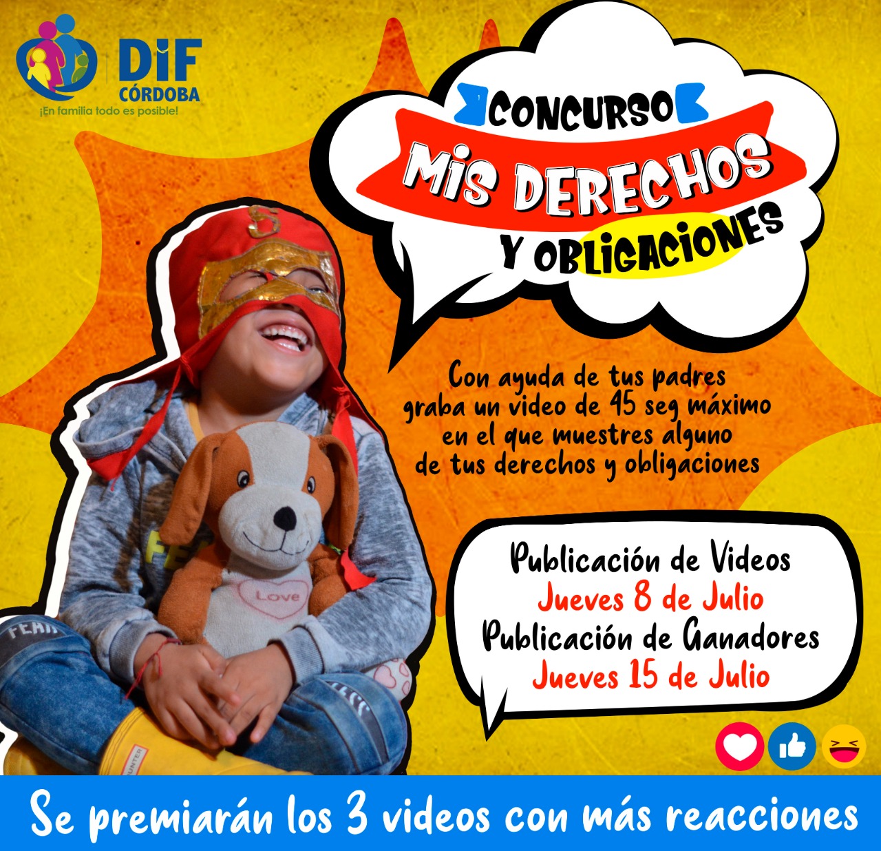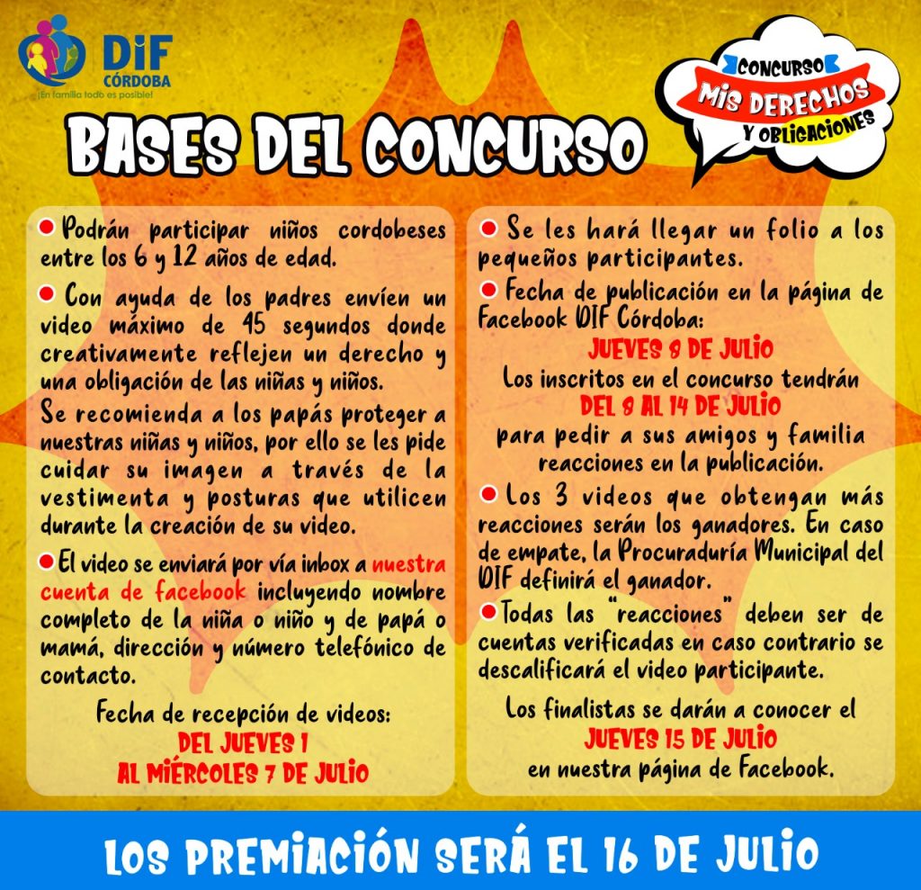 El concurso consiste en que las niñas y niños con apoyo y aprobación de sus padres o tutores, compartan a partir de este jueves 01 y hasta el miércoles 7 de julio vía inbox en la página de Facebook DIF Córdoba un video con una duración de 40 a 45 segundos donde haga alusión de alguna obligación o derecho de los niños.