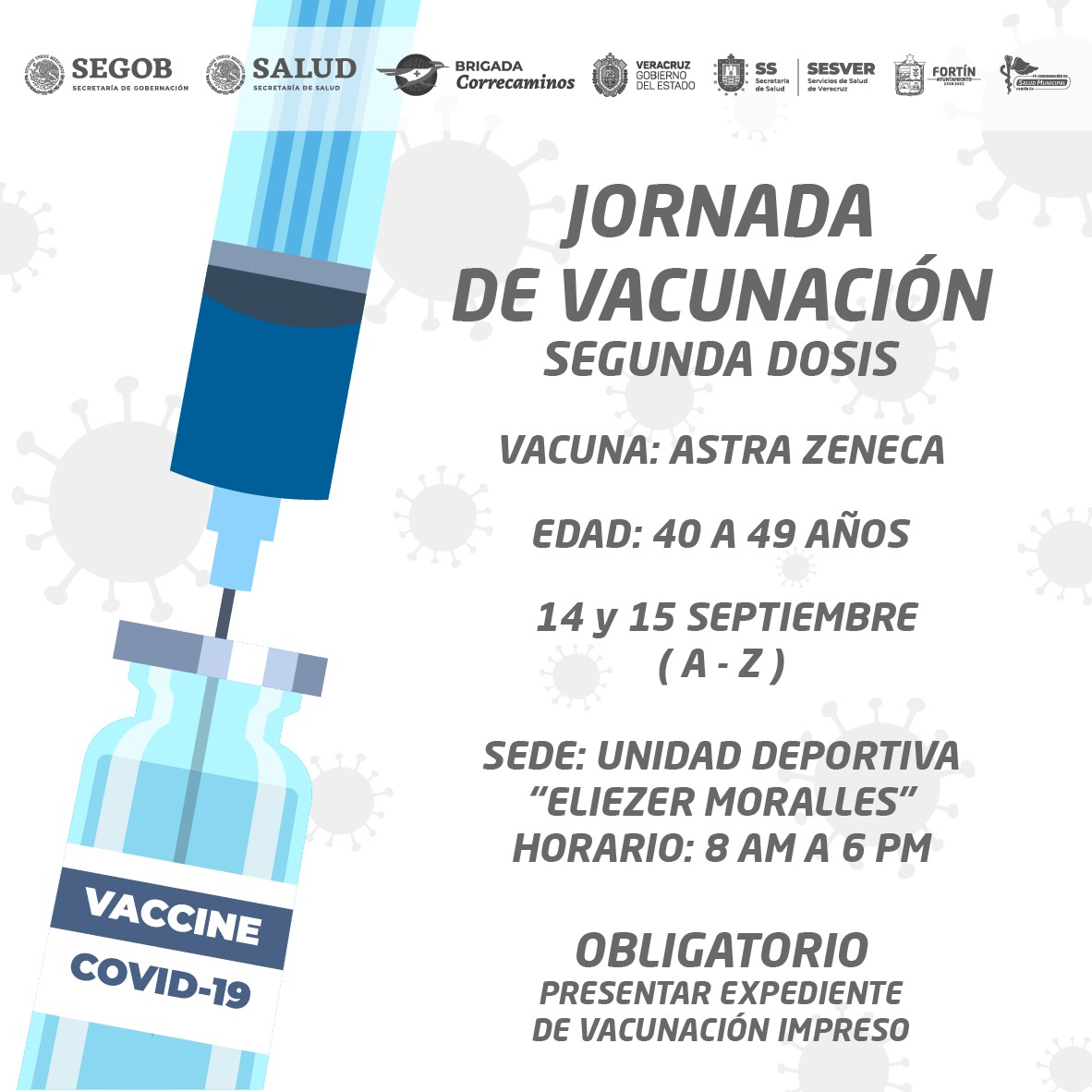 Ixhuatlán Del Café.- Será el próximo 14 y 15 de septiembre cuando se realice la jornada de vacunación correspondiente a la aplicación de la segunda dosis AstraZeneca, dirigida a habitantes de Ixhuatlán Del Café entre los 40 y 49 años de edad que en julio pasado se aplicaron la primera dosis.