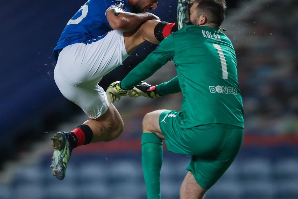 El delantero del cuadro escocés Kemar Roofe, quien apenas tenía unos minutos de haber entrado al juego, llegó con la pierna arriba y su zapato se impactó de lleno en la cara del portero Ondrej Kolar.