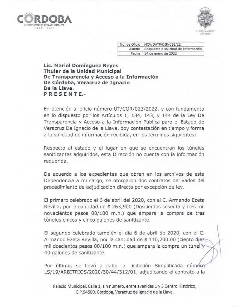 El primero de ellos se celebró el 6 de abril 2020 con Armando Ezeta Revilla, por la cantidad de 263 mil 900 pesos, que ampara la compra de tres túneles chicos y cinco galones de sanitizante.