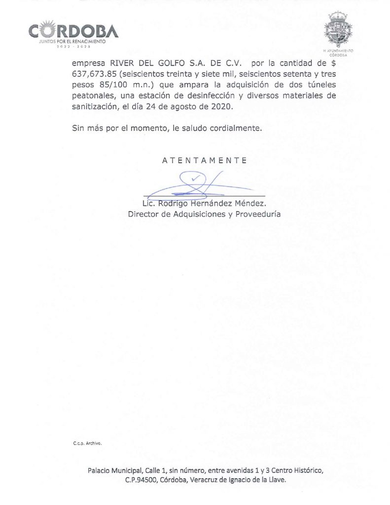 En ella se ampara la compra de dos túneles peatonales, una estación de desinfección y diversos materiales de sanitización, el 24 de agosto de 2020.