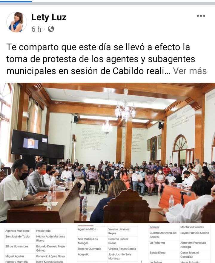 Ayer domingo, la hija de la ex presidenta Leticia López Landero nuevamente no se presentó a Sesión de Cabildo, pero eso sí presumió en sus redes sociales que efectuó la toma de protesta de los agentes y subagentes municipales.