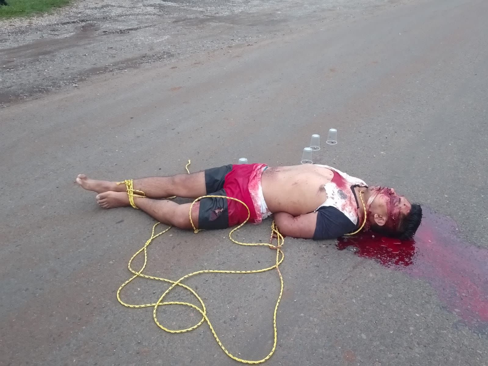 La víctima tenía los pies y manos amarrados con cuerda de plástico, además presentaba huellas de tortura e impactos de arma de fuego.