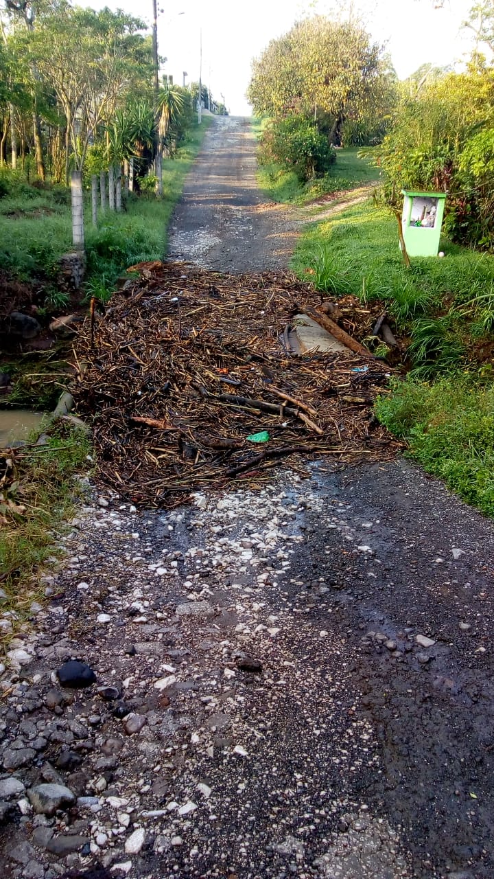Con apoyo de una retroexcavadora, personal municipal retiró ramas, piedras y demás basura que fue arrastrada por las lluvias de las últimas horas, provocando la obstrucción de esta vía de comunicación entre la comunidad.