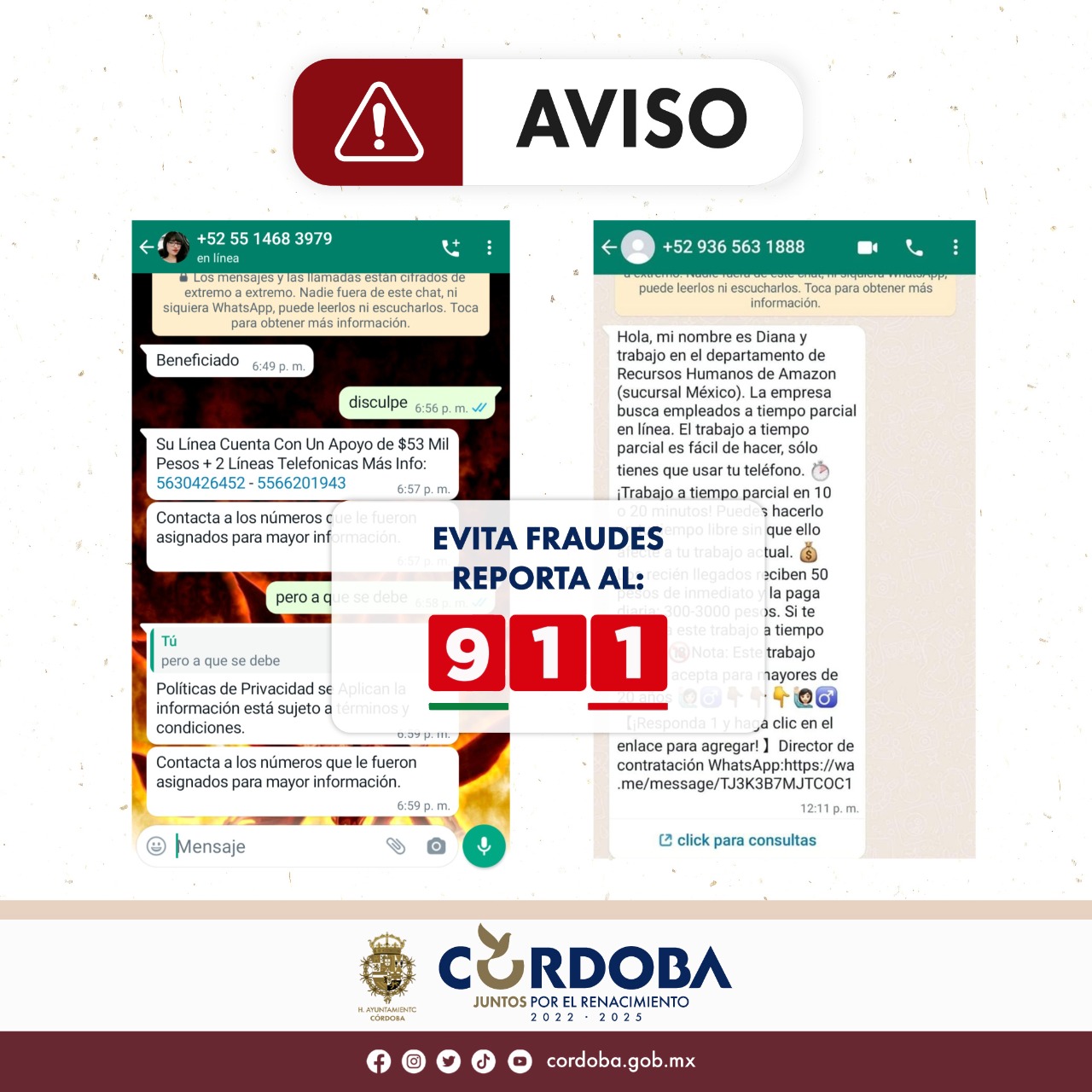 Córdoba, Ver. – A fin de evitar casos de extorsión y fraude, la dirección de Protección Ciudadana y Movilidad emitió un llamado a la ciudadanía a no caer en este tipo de llamadas o mensajes en el que fingen ofertar bolsa de trabajo o premios, por lo que pidió reportar al 911.