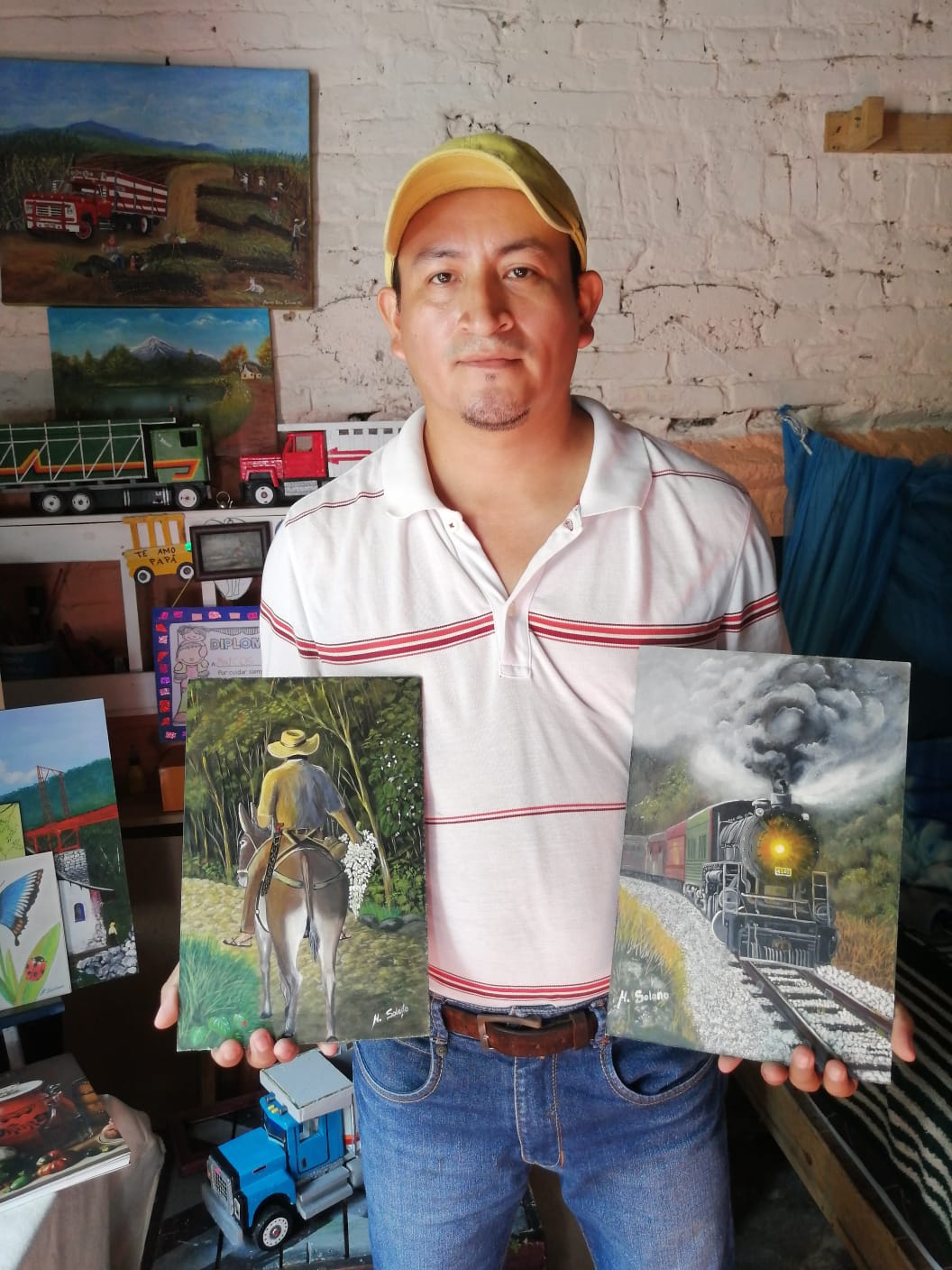 Pero no sólo es la pintura lo que él sabe hacer; pues esa destreza por las manualidades lo ha llevado a crear camiones, avionetas y animales a escala, creadas con madera y basura reciclaba.