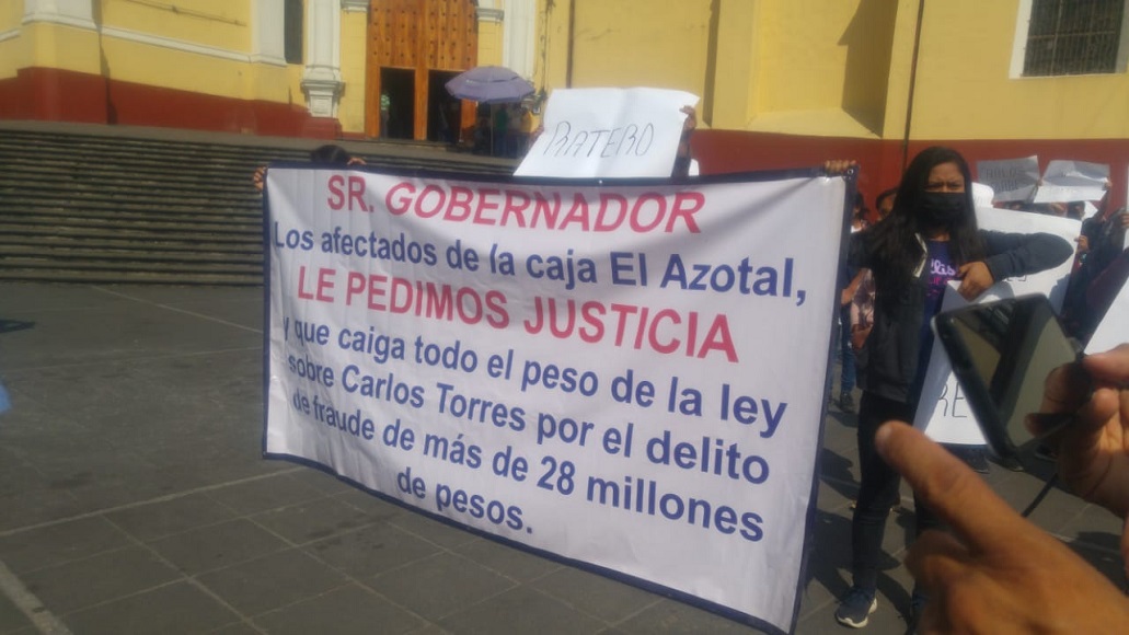 Xalapa, Ver. – Habitantes de Altotonga y Martínez de la Torre se manifestaron en plaza Lerdo para denunciar que el precandidato a diputación federal de Morena por el VII Distrito con cabecera en Martínez de la Torre, Juan Carlos Torres, fue partícipe del fraude a más de 200 personas que tenían sus ahorros en la caja solidaria “El Azotal”.